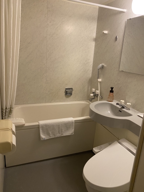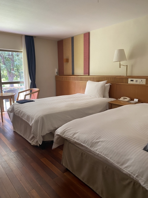 部屋は、ベッドが2台、バスルーム、物干しラックと椅子、テーブルがあるベランダ、テレビ、冷蔵庫、湯沸器などがあります。また、玄関が広いので浮き輪やマリンスポーツグッズなども置けるんです。