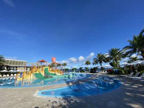 スライダーがある子供用のスプラッシュパーク、子供と大人が使えるプール、1日¥6,000で借りられるカバナ、チーズバーガー(¥2,050)やガーリックシュリンプ(¥2,040)が食べられるカフェ、ビール(¥1,000~)やカクテル(¥1,200~)が飲めるバー、シャワールーム、レクレーションなどの申込が出来るビーチステーションがあるんです。
