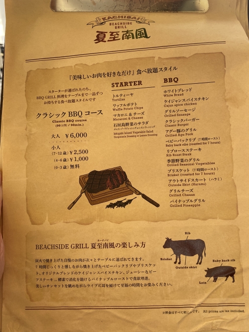 アメリカのBBQとライブが楽しめる夏至南風は、サンセットを眺めながら食事が出来るレストラン。食事は食べ放題で、スタッフが運んでくれるスタイルなんです。前菜は、サラダやポテト、マカロニチーズ、メインは、リブロース、ハラミ、ケイジャンチキン、スペアリブ、ハンバーガーなどで、味も量も大満足。ドリンクは、沢山飲む方は飲み放題がおすすめ。