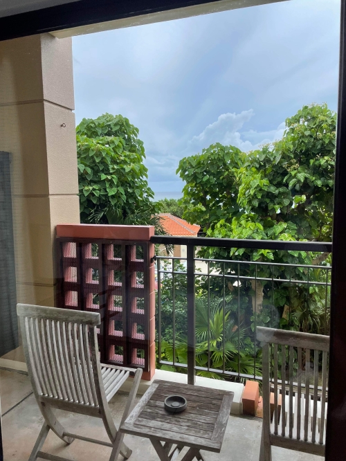 部屋には、除湿機、机と椅子、冷蔵庫、セーフティーボックス、クローゼット、水着などを干せるベランダもあります。ベランダの椅子に座って、美しい石垣島の景色も楽しめるんです。