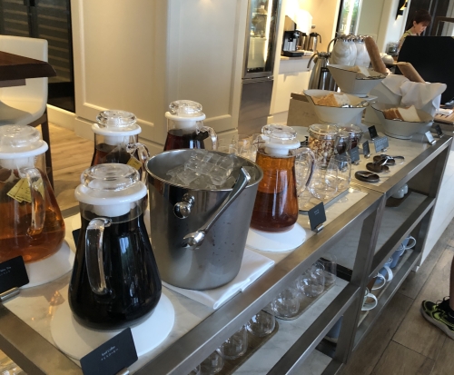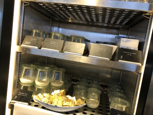 自由に取りに行けるカウンターには、ナッツ各種、チョコ、クッキーや果物など、また小さい缶で、コーラ、スプライト、ウィルキンソンの炭酸などなども置かれています。