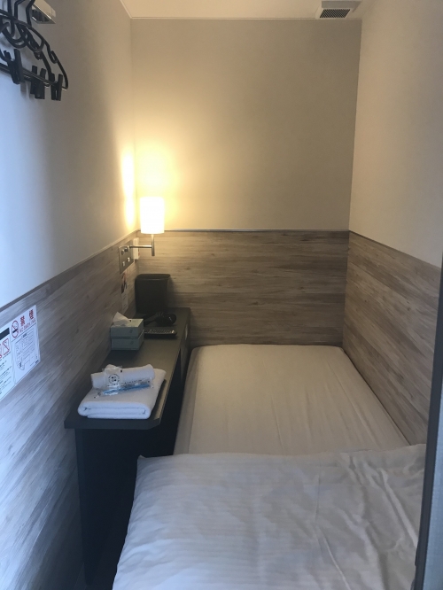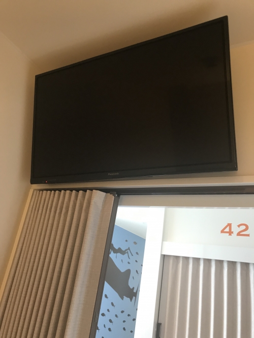またカプセルホテルながら、仕切りには厚手のアコーディオンカーテンが付いているので、閉じてしまえばプライバシーもしっかりと守られます。各部屋TV、大きめのセキュリティーボックス、ハンガー付きです。