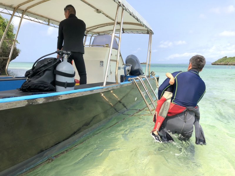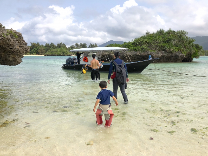 川平湾岸での遊泳は禁止されているのは冒頭でもご紹介した通り。なので、まずはボートで沖まで出ます。ボート乗り場まではスタッフさんが車で連れて行ってくれます。