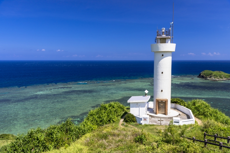 市街地から車で1時間、空港からは車で40分ほどかかりますが、それでも足を運びたい絶景スポット。石垣島の最北端に位置する「平久保崎」に佇む灯台で、コバルトブルーに輝く海とサンゴ礁に囲まれています。
