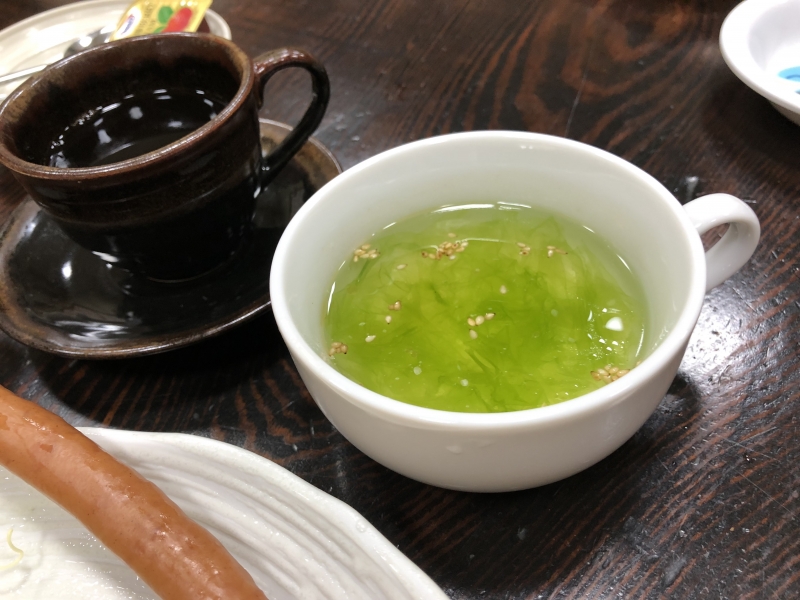 例えばこの日のスープ。アーサー(アオサ)のコンソメスープなのですが、なんと、アーサーは早朝に女将さんが近くのビーチから採ってきたばかりのものだとか。「乾燥のもあるけど色が良くないし、やっぱり採れたては美味しいですヨ!」と。