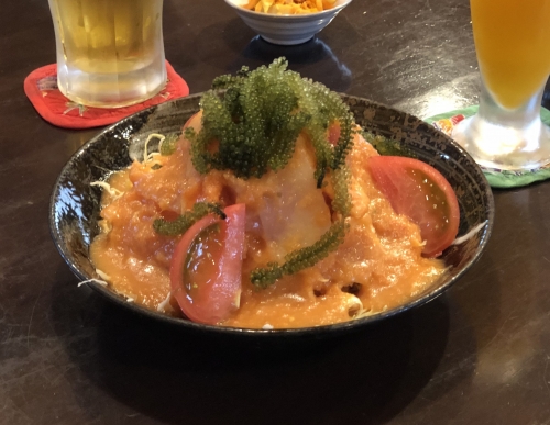 寿司ネタケースもある「味屋じんべい」は、店主が魚釣り好きということもあり、本当の地魚が楽しめます。特に 刺し盛り はオススメ!その他にも、沖縄ならではの一品料理や定食もあります。