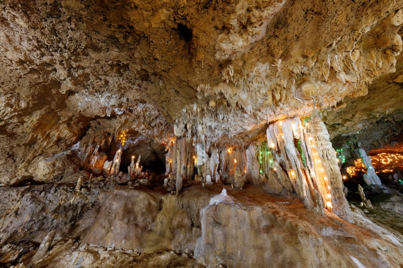 日本最南端にある、サンゴ礁から生まれた鍾乳洞です。石垣島で最大の鍾乳洞で、全長3.2kmのうち見学できるのは660mのみ。鍾乳洞内をイルミネーションで幻想的に彩ったのは、「石垣島鍾乳洞」が世界で初めてです。