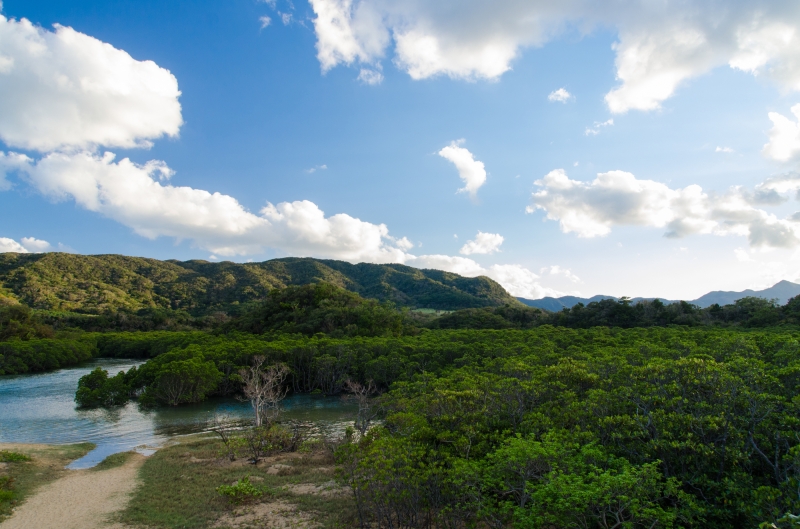 ヒルギとはマングローブの種類のことで、「吹通川(ふきどうがわ)ヒルギ群落」は石垣島内最大のマングローブ群生地です。干潮時と満潮時では、景色が大きく変わるのが特徴。干潮時には歩いて散策しながらヒルギを間近に見ることができたり、カニやハゼなど様々な生き物に出会うことができます。