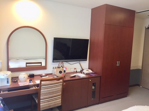 ベッドの反対側には机やクローゼットがあります。机の上に置いてある、時計や小物入れがアンティークでオシャレです。更に、アロマポットも置いてあり、ローズやグレープフルーツの香りに癒されます。