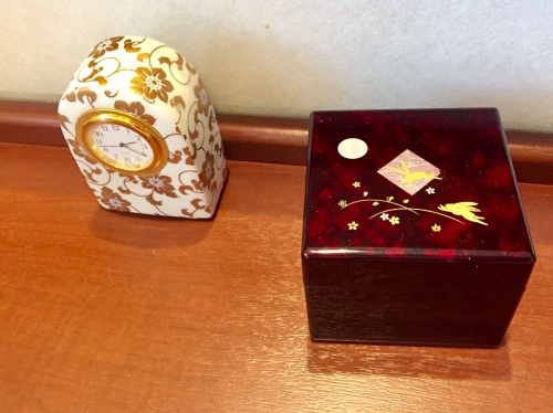 仲居さんや従業員の方が客室まで荷物を運んでくれますが、お茶を入れてくれるサービスはありません。そのかわり、宿オリジナル「吉祥饅頭」や九谷焼の急須と湯飲みが用意されているので、好きなタイミングでお茶菓子やお茶をいただけます。