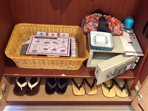 クローゼットの中には、男女の浴衣や下駄がサイズ違いで用意されています。女性に関しては、1階で色浴衣のレンタルがあるので(無料)、そちらの浴衣を着るのもありですよ♪