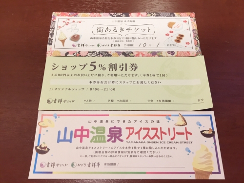 ウェルカムパンケーキや、夕方と朝に利用できる湯上りサービス、女性や一部プラン限定で付く温泉街散策時のチケット、毎晩行われる「山中節の夕べ」、姉妹旅館「かがり吉祥亭」のお風呂に入れるサービス等、特典を受けるだけで充実した時間を過ごせますよ。