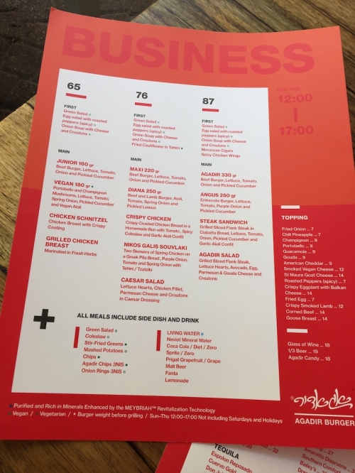 メニューは英語とヘブライ語のものがあります。内容はイスラエルの定番メニューがちょっと加わった、アメリカンなハンバーガー屋といった内容です。イスラエルで人気のハンバーガーチェーン「モーセ」をもとにしたような内容でした。