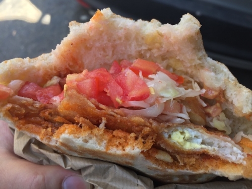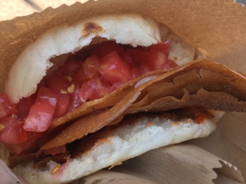 注文すると5分ほどですぐ出来上がります。筆者が注文したのは卵のブリックです。ブリックがピタパンに挟まれており、ハンバーガーのような構造。トマトとキャベツも含まれています。