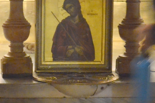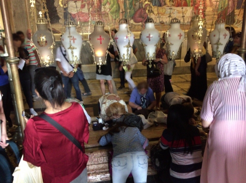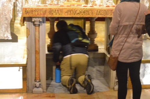英語では「Stone of Anointing」と呼ばれ、磔刑後に死んだキリストの体を置いて聖油で清めたとされる場所です。聖墳墓教会入ってすぐの正面に位置するため、最も目立つスポットで、常に信者がひざまずいてお祈りしています。