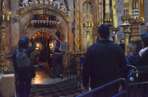 聖油の石板を左に進むと、天井が高いホールのような空間があり、そこにキリストの墓が存在します。エディクラ(祭壇)と呼ばれる建物に覆われており、入場するための行列ができています。この空間は、英語で「Tomb of Jesus/Rotunda and Aedicule/Anastasis」とよばれています。