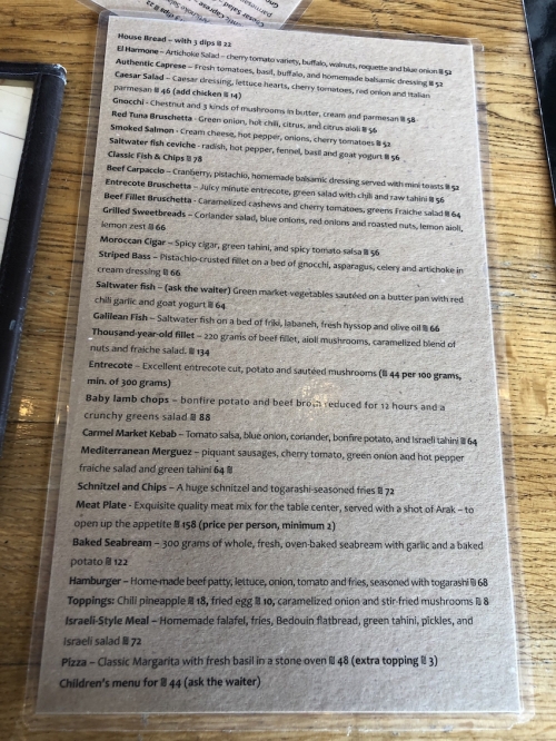 料理の内容は、中東料理と地中海料理の中間のような、典型的なイスラエルの現代メニューといった内容です。イスラエルの定番料理を期待する人も楽しめると思いますし、ハンバーガーやピザなどの万国共通のメニューもありました。