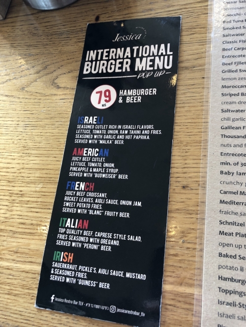 レギュラーメニューはプリントで1枚にまとめられています。イスラエルの公用語はヘブライ語ですが、英語のメニューもあるので、観光客にとってもありがたいように思います。筆者が訪れた際には期間限定で、ハンバーガーのインターナショナルメニューを楽しめる期間だったようです。