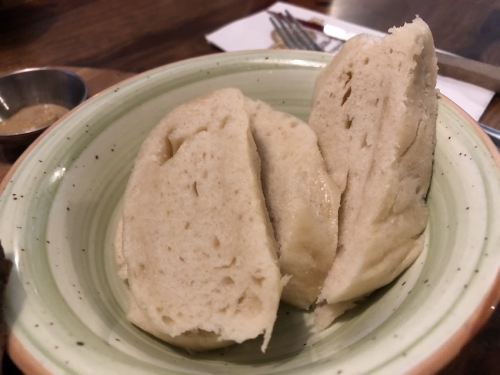 付け合わせはチェコ料理の定番の一つである「クネドリーキ」です。パンのような食べ物で英語では「dumpling」と表記されていました。