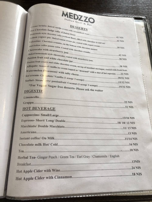 王道のイタリア料理に、肉料理や、イスラエルの定番料理が混ざるといった内容です。メニュー表は、英語とヘブライ語のものがあります。