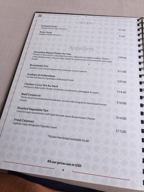「ノートルダム・ルーフトップ」のメニューは英語です。これだけだと普通なのですが、値段がアメリカのUSドルで表記されているのが特徴的です。アメリカから来るキリスト教観光客が多いことが伺えます。