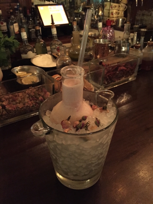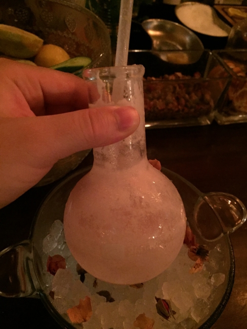 ハイビスカス風味のラムを使ったピニャコラーダです。丸底フラスコにピンク色のカクテルが注がれ、男子には恥ずかしいくらい可愛いです。