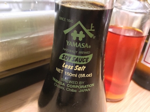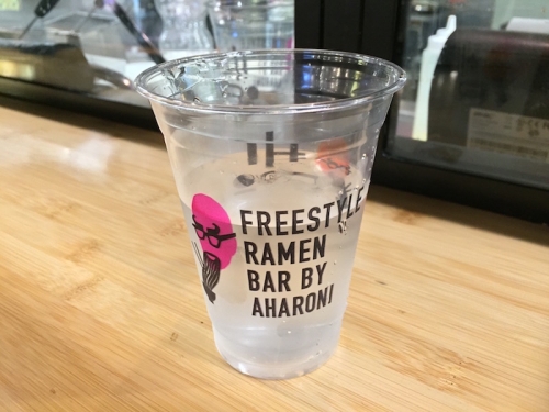 ラー油と減塩醤油もスタンバイ。お水のコップにもがっつりロゴが入っており、ブランディングに抜け目がない印象です。