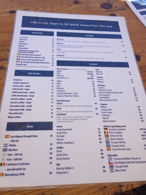 遊歩道沿いにあるため観光客にも非常に人気のようで、英語メニューが完備されています。一枚のプリントの両面印刷で、とても見やすいです。メニューは欧米の一般的なギリシャ料理のレストランといった内容です。