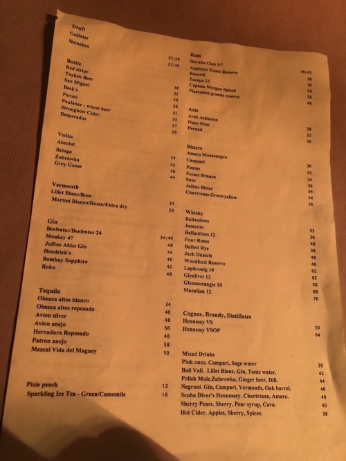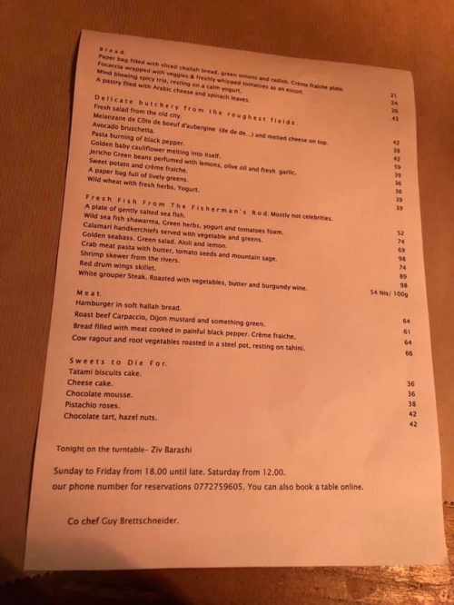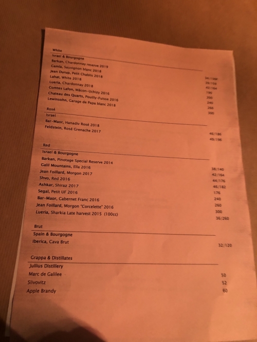 ドリンクメニューはワインやリキュールが各種揃っており、 フードメニューは一枚のプリントにまとめられています。他のレストラン同様、 英語とヘブライ語のメニューがあります。