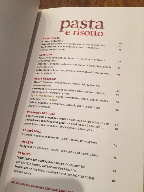 メニューは英語とヘブライ語のものがあります。 表紙にはロゴが描かれ、 メニューもどこか凝った印象です。料理の内容は、欧米先進国の一般的なイタリアンレストランといった内容です。