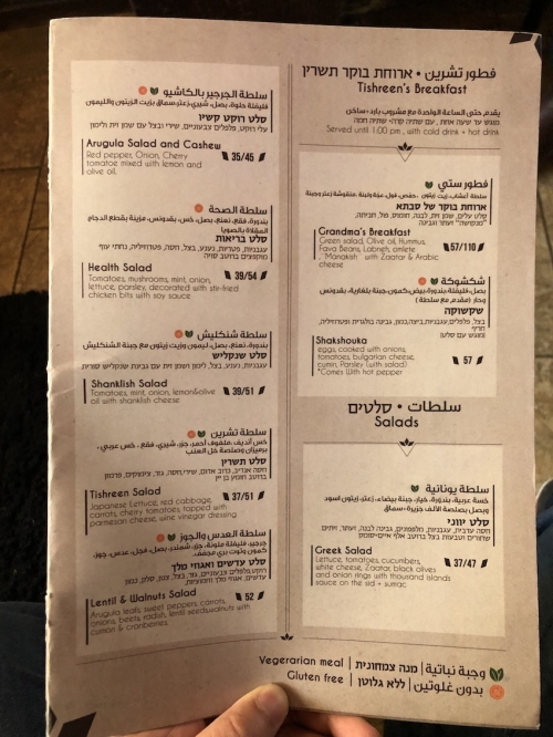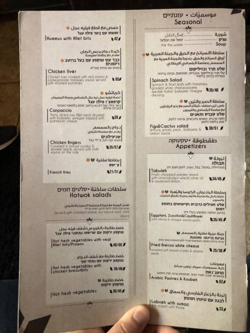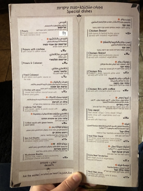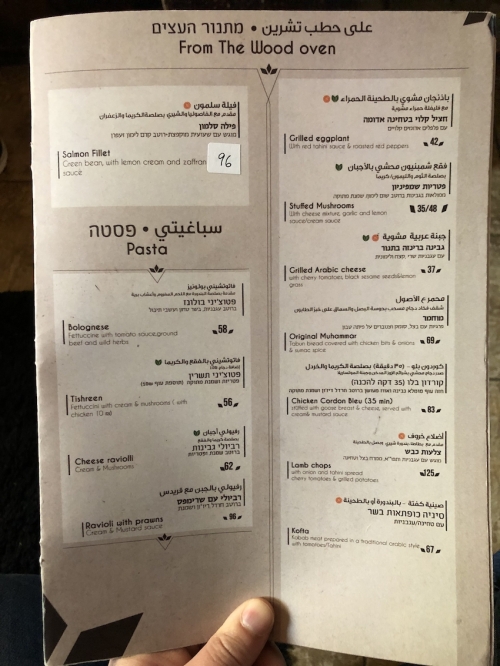 メニューは、アラビア語・ヘブライ語・英語で記載されています。ナザレはアラブ系住人が多い町でもあることから、アラビア語が優位の表記のようにも見えました。