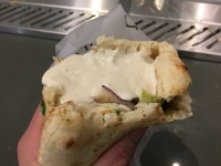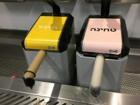 ![]() 写真:がぅちゃん イケアのカフェテリアのフムス | ![]() 写真:がぅちゃん イケアのファストフード屋に常備してあるタヒーニ(右)とマスタード(左)のポンプ。 | ![]() 写真:がぅちゃん イケアのファラフェルサンドにかかったタヒーニ |