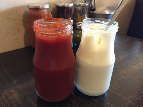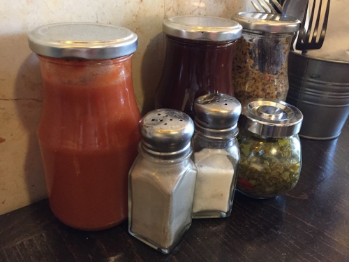テーブルにはケチャップ、マヨネーズ、ピクルスなど複数の調味料が置いてあるので、好きにカスタマイズして食べられます!