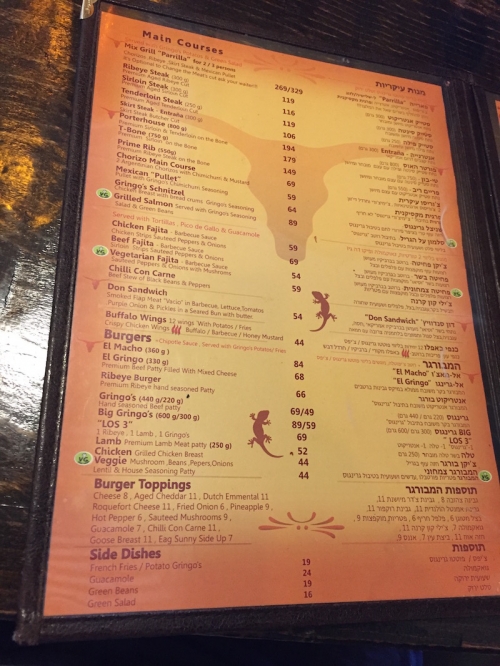 英語とヘブライ語のメニューがあります。以下はメニューの一例です。