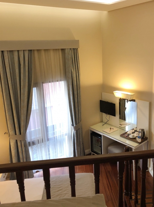 ホテルはカラキョイの駅や埠頭から近く、周辺にはカフェやレストランも多いのに、部屋はまったく気にならないくらい静かです。シンプルで洗練されたインテリアで統一されており、落ち着いた空間で時間を過ごすことができます。個人旅行で利用するのはもちろん、2階構造になっている広めのファミリールームもあるので、数名で宿泊したいときもおすすめです。
