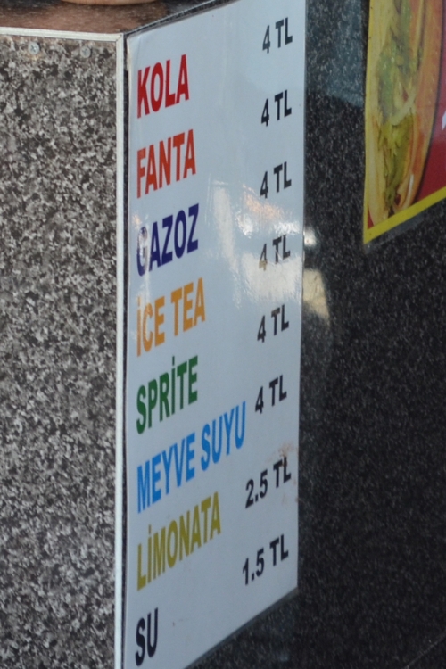 メニューはとてもシンプルで、コーラやファンタなどのジュース類は約4トルコリラ(72円)。 サバサンドは12トルコリラ(216円)です。