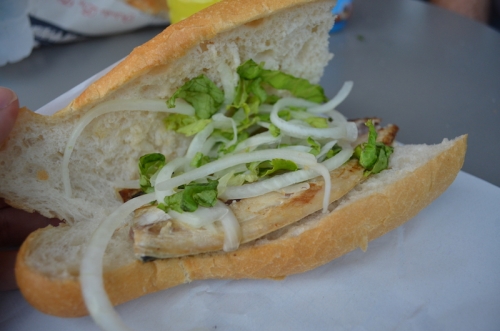 こちらがサバサンドです。内容は非常にシンプルで、焼かれたサバ、生玉ねぎ、レタスがフランスパンのようなパンに挟まれています。