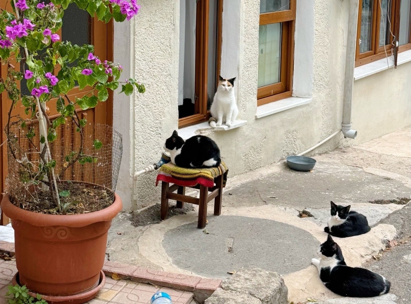 壁のつたや色あせた木の扉、花で彩られたバルコニーなど、写真に収めたくなる風景ばかり。そんな街角では、気ままに歩く猫たちにもよく出会います。人懐っこく、まるで島の住人のようにのんびりと日なたでくつろぐ姿に癒されることでしょう。