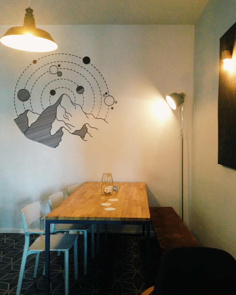 床面の模様や、壁面のアートも宇宙を思わせる内装で統一されています。どの席を選ぼうか迷ってしまうくらい、ワクワクする店内です。