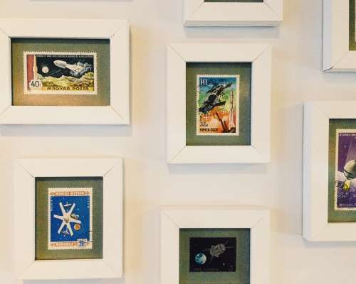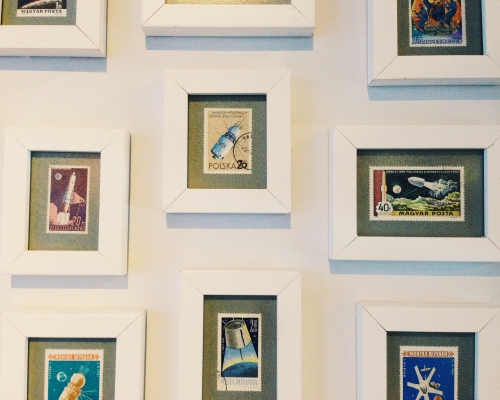 壁に飾られている宇宙の切手はどれも一枚一枚異なっていて、つい見入ってしまいます。宇宙好きの店主が小さいころから集めていたものだそうです。