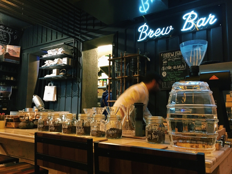 バーのような雰囲気ですが、ほかのカフェに負けじとコーヒー豆もたくさん揃っています。透明の瓶に入っているのがなかなかおしゃれです。