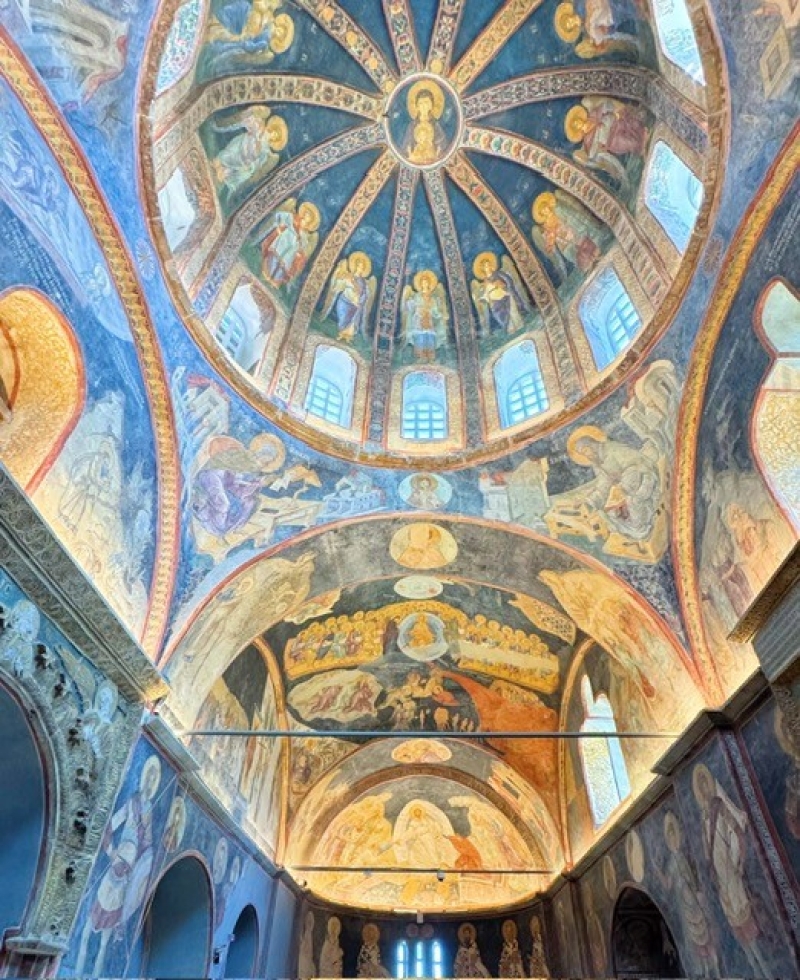 建設後は地震や戦乱により度重なる修復と改築を経て、現在の建物は主に11〜14世紀にかけて整えられました。特に、パライオロゴス王朝時代の14世紀、宰相テオドロス・メトキテスによって行われた大規模な改装では、内部に素晴らしいモザイク画やフレスコ画が施され、ビザンティン美術の最高峰のひとつに数えられる教会となりました。
