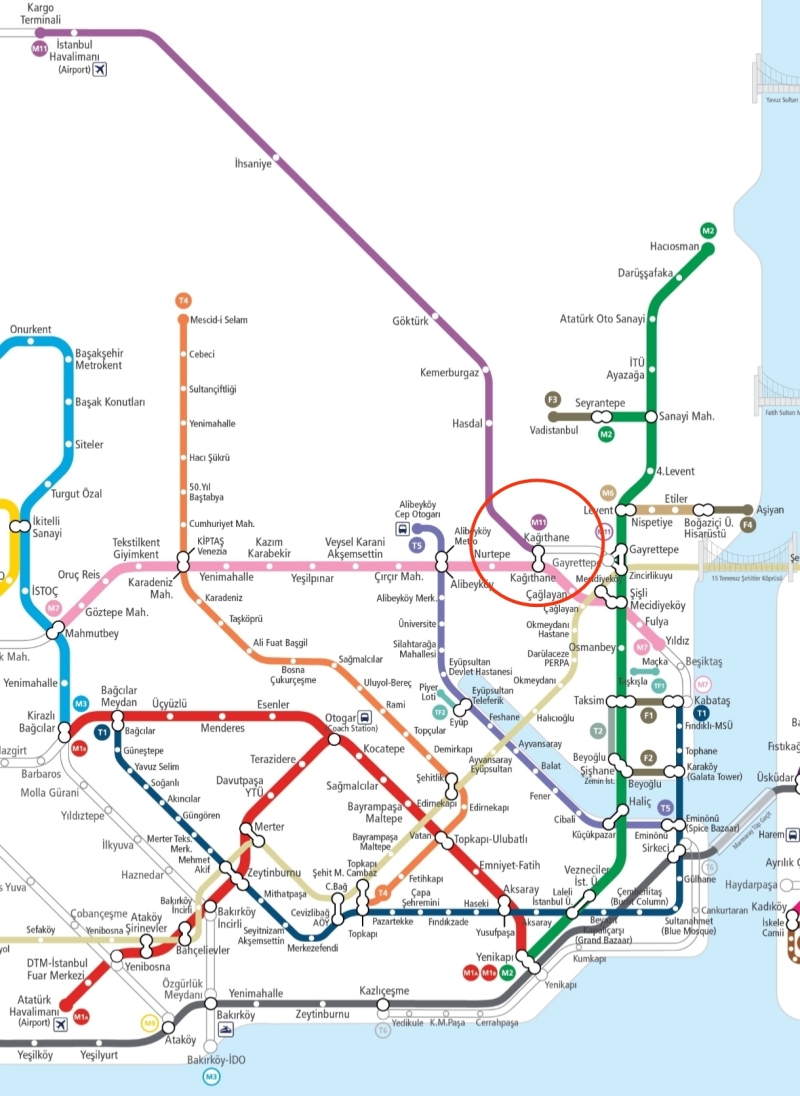 荷物が少なかったり、宿泊先や目的地が地下鉄や路面電車の駅から近い方は、新しく開通した地下鉄M11線を利用するのもいいでしょう。M11線は空港からヨーロッパ側新市街のキャウトハーネ(Kağıthane)まで開通しています(2023年9月現在)。