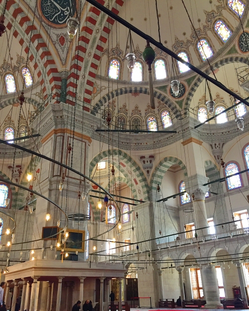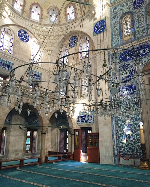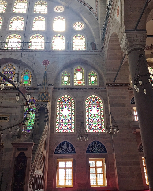 モスクに入るとまず前面がほぼ窓!という大胆な内装に驚きます。スィナンによるモスクの作品の中でもこの手法は珍しいものです。天井から吊るされている照明の灯りがなくても十分に明るく、ステンドグラスに差し込む太陽の光が神秘的にモスクを彩っています。