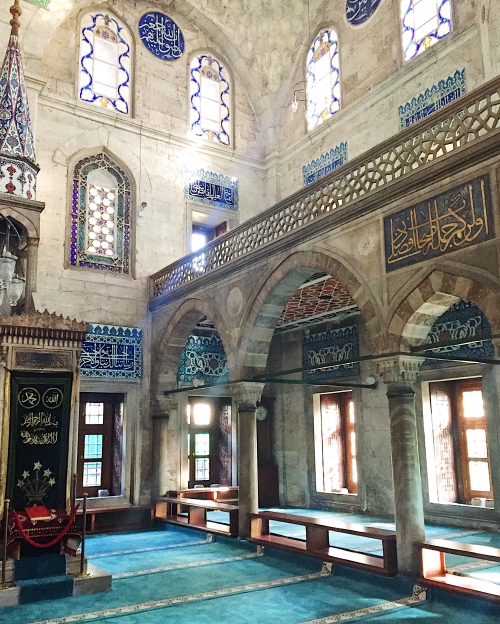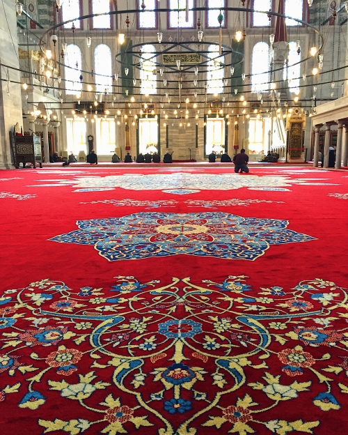いまみることができるのは1771年に再建されたバロック様式のモスクですが、ミフラーブは1470年に完成した当初のものが残されています。切れ目なく続く、花の模様が美しい真っ赤な絨毯がいかにもトルコらしいモスクです。決まったお祈りの時間以外にも人の出入りが絶えまないモスクで、人々の信仰心の深さを垣間見ることができます。