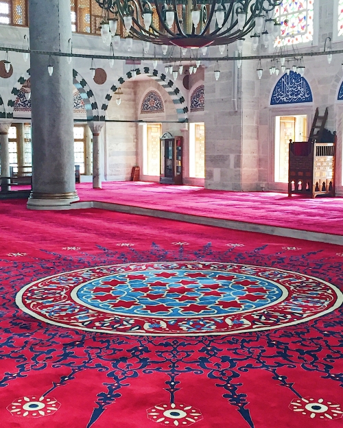 Mihrimahは「太陽と月」を意味する名前です。ステンドグラスの色形の繊細さ、吊るされた照明の天体のように丸い形、円形の模様が美しい絨毯のように、Mihrimahを思わせる要素が随所に詰まっているモスクです。スィナンの彼女に対する気持ちの表れなのかもしれませんね!