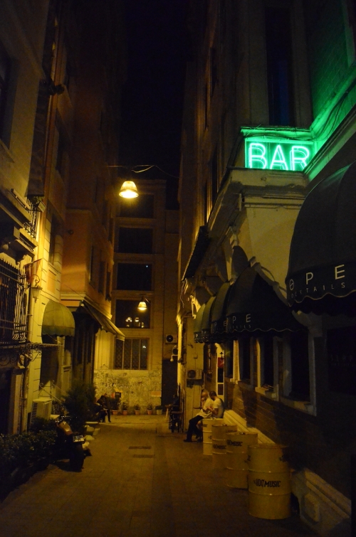 バー「Parantez」はこのような、いかにもイスタンブールらしい通りにあります。バーのネオンが光る人静かな通りもありますが、危険というわけではないようです。