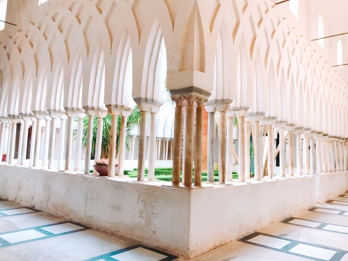 見事な回廊が巡る中庭は、言葉の通り「天国」といえるほど美しく、白い柱廊と庭の緑のコントラストがたまりません。