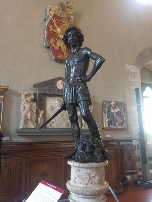 中世の時代、侵略してくる諸外国から街を守ろうとするフィレンツェ共和国の人々にとって、強大な敵に勇敢に立ち向かうダビデは市民のシンボルとなり、現在でもフィレンツェの人達にはとっては大きな意味を持つ重要なものだそうです。