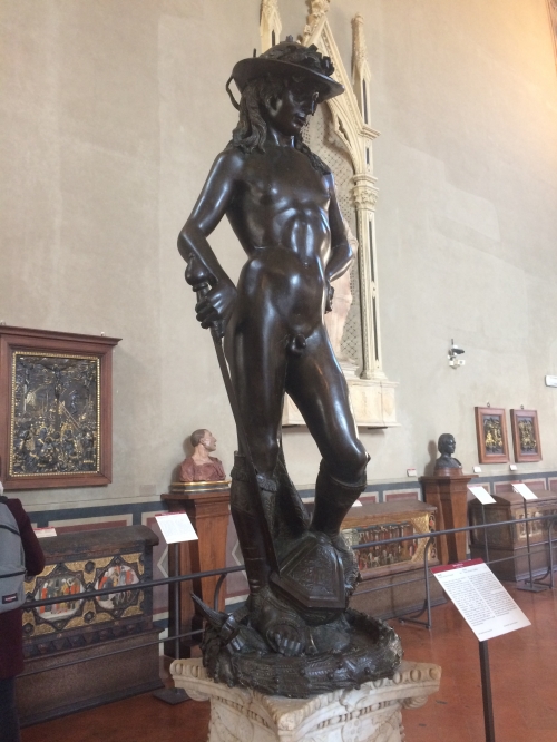 こちらの美術館には、ミケランジェロよりも先に作られたダビデ像が展示されています。ドナテッロの作品とヴェロッキオの作品です。